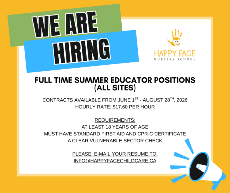 Please email info@happyfacechildcare.ca for more information or to apply.